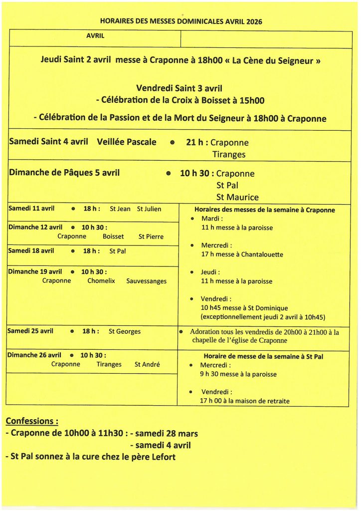 Infos et horaires Vie de paroisse Horaires des messes Ensemble Paroissial de la Sainte Famille 1, place croix des missions 43500 Craponne/ Arzon Paroisse 04.71.03.21.78 Père Jérôme TRAN 06 75 37 87 39 Père François Lefort : 06 78 28 47 84 Contacter par Mail Vous souhaitez Baptiser votre enfant Catéchiser votre enfant Célébrer votre mariage Les coordonnées d'un mouvement Horaires des messes Texte et saint du jour mercredi 29 avril 2026 Sainte Catherine de Sienne - Religieuse dominicaine, Docteur de l'Église (+ 1380) Mt 11, 25-30
